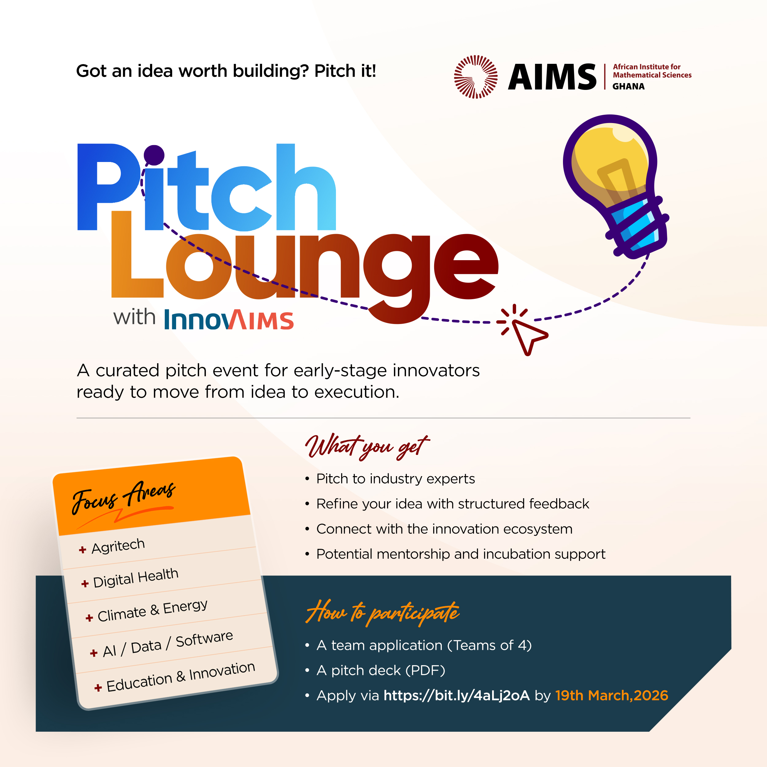 AIMS Ghana through InnovAIMS, invites young innovators to participate in the Pitch Lounge: a three-day Hackathon and a dynamic platform designed to spark technology-driven solutions to real societal challenges.